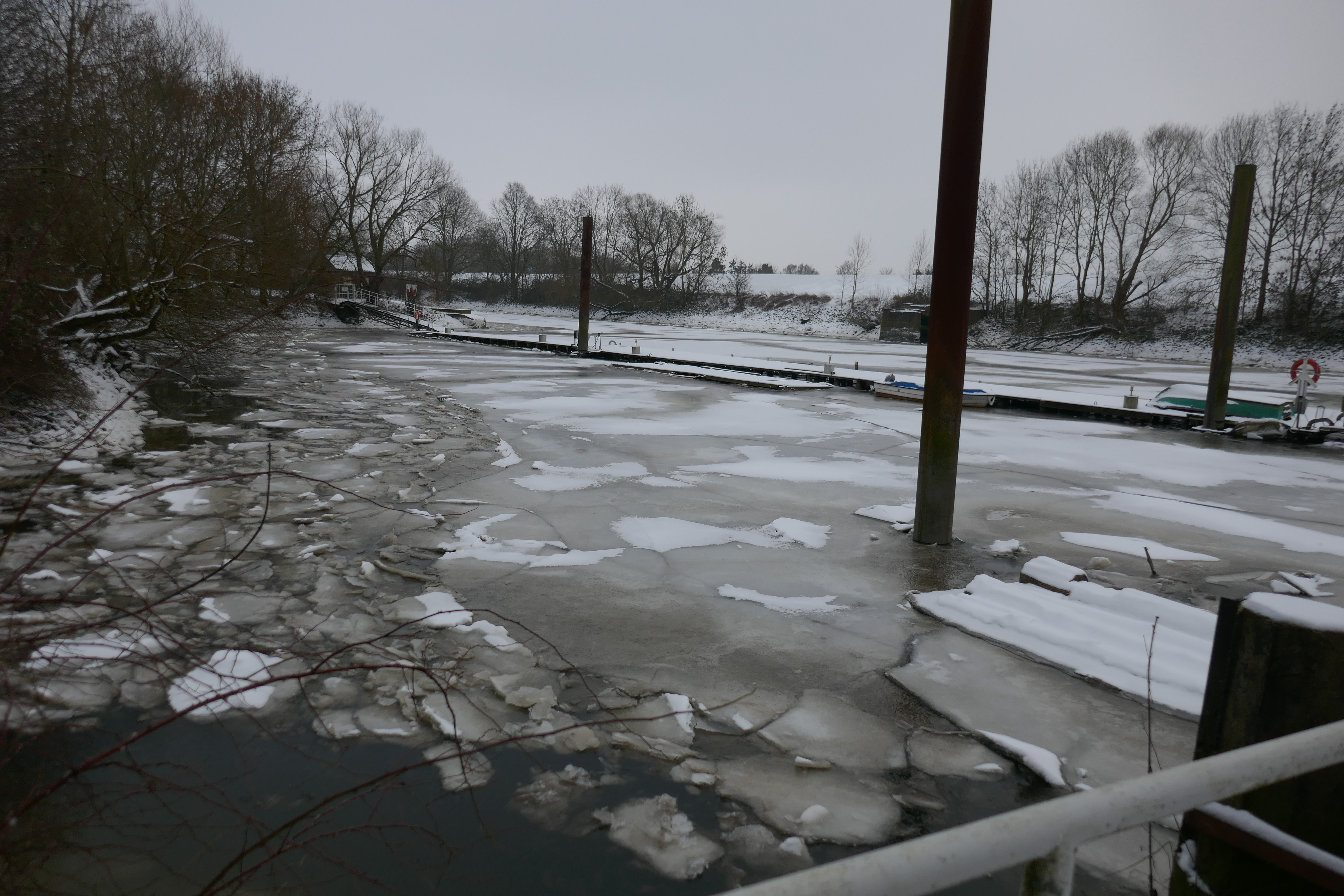 Es war schon ein Abenteuer überhaupt das Bootshaus zu erreichen, denn die Straße mit der Steigung/Gefälle des Deiches war sehr sehr glatt.